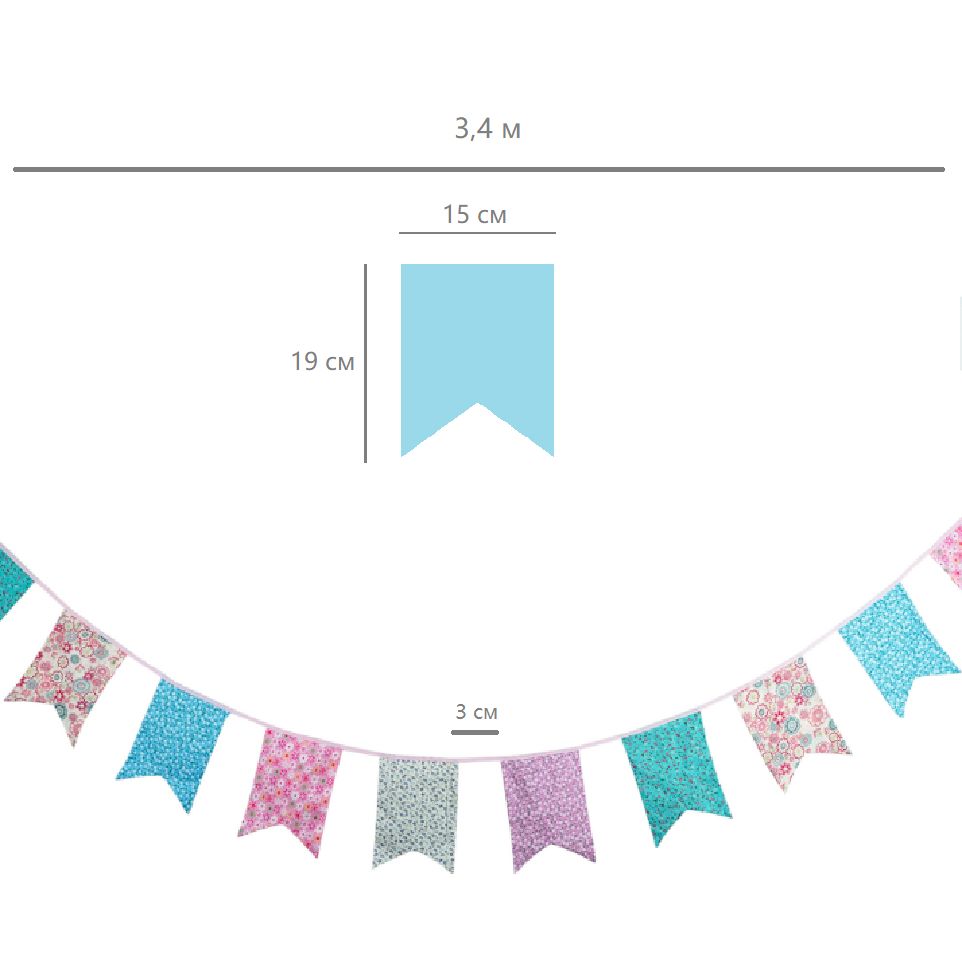 Гирлянда состоит из 12 флажков, общая длина составляет 3,4 м, расстояние между флажками 3 см, длина матерчатых флажков 2,1 м, длина лямок с обеих сторон по 50 см
