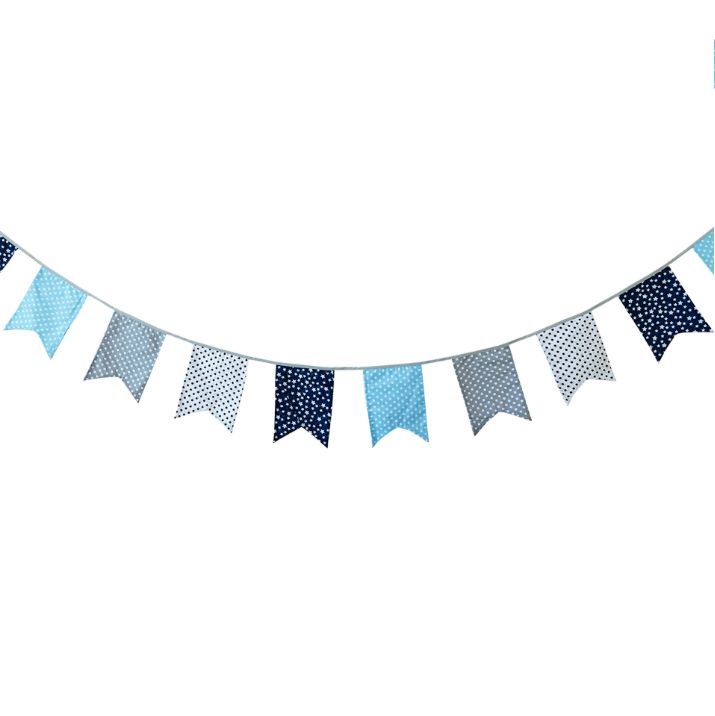 Гирлянда состоит из 12 флажков, общая длина составляет 3,4 м, расстояние между флажками 3 см, длина матерчатых флажков 2,1 м, длина лямок с обеих сторон по 50 см