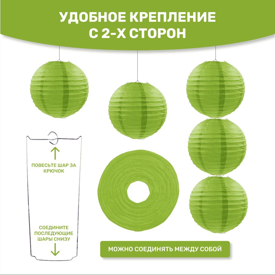 В комплект входит 8 бумажных фонариков и лента атласная.
