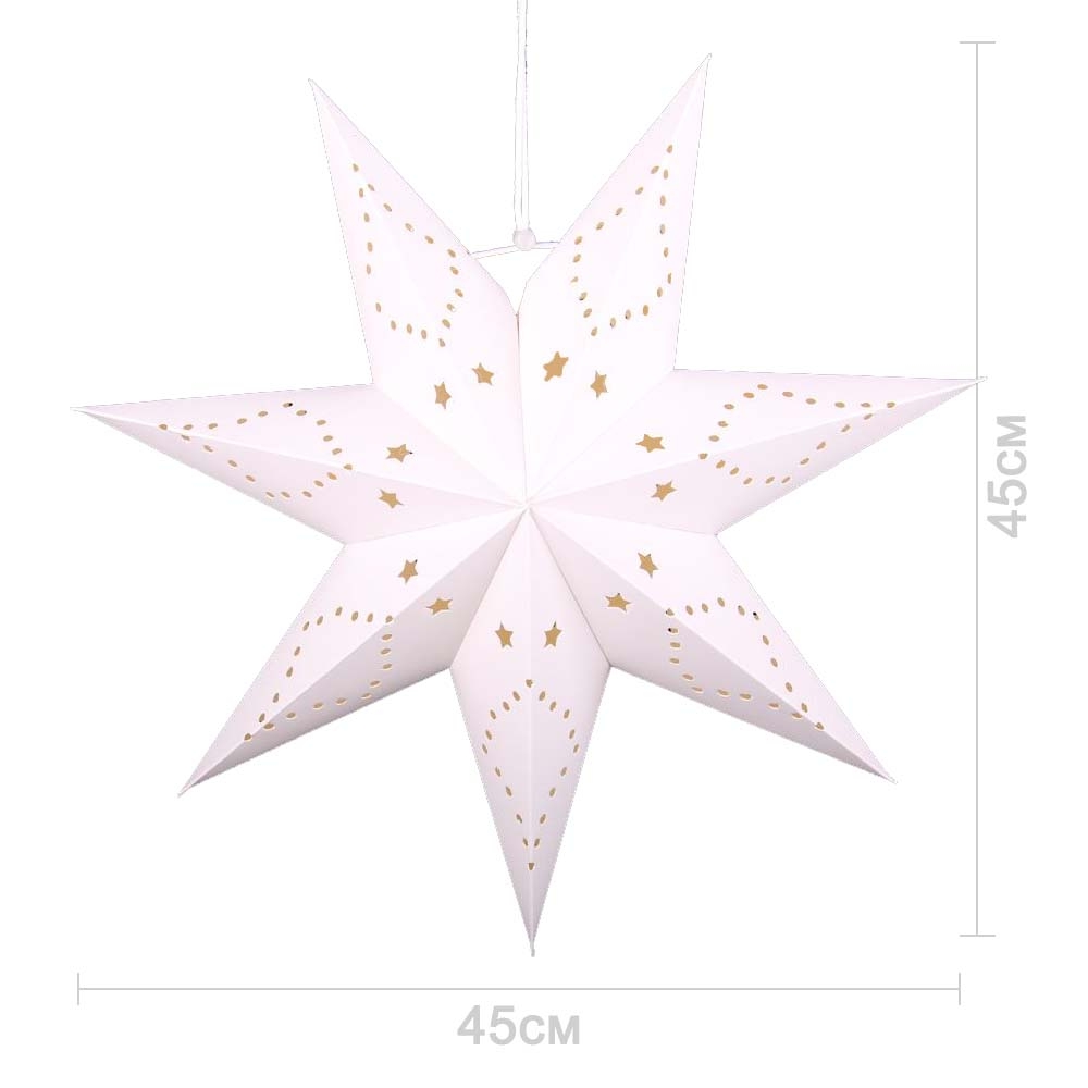Семиконечная объемная звезда 45 см — великолепный декор из тонкого перфорированного картона. Создает красивые световые эффекты. Поставляется в сложенном виде, в комплекте шнур для фиксации объема и подвеса.